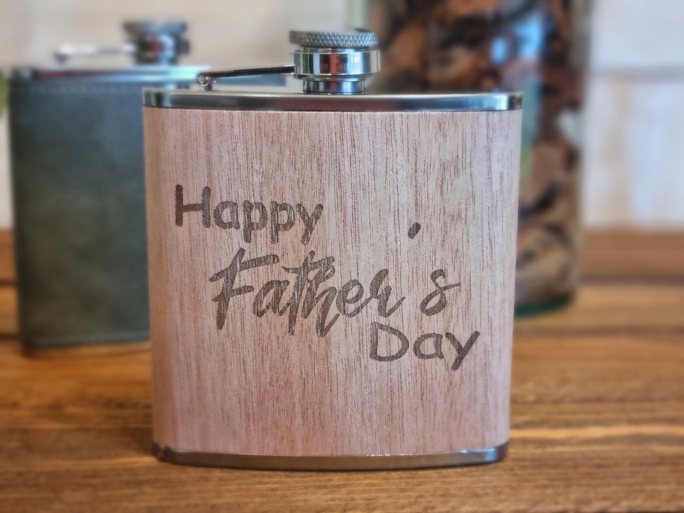 Personalised Steel + wood Effect 6oz Hip Flask. *FREE ENGRAVING*